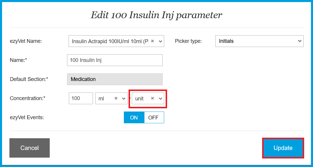 To have Units instead of ml, we recommend reorder the units of measurements for the Concentration in the Insulin parameter settings as 1 unit per unit: