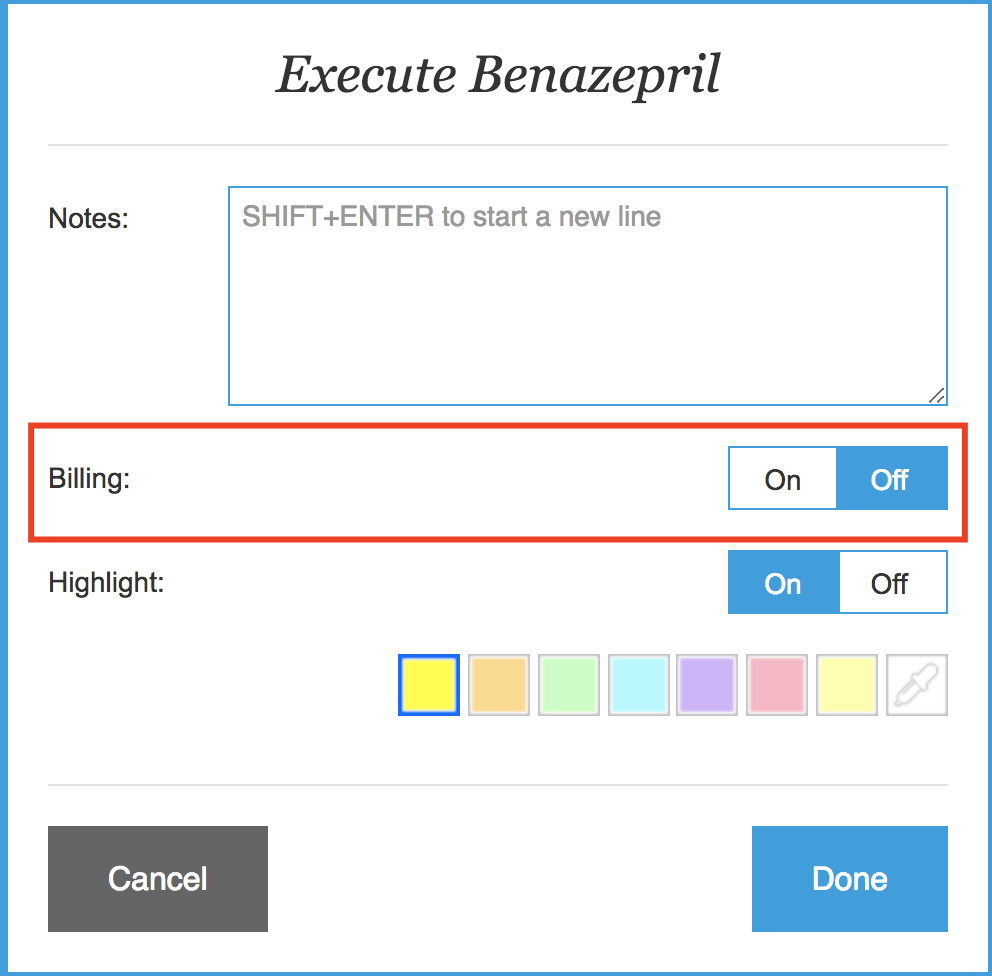 - If you are using Smart Flow with a billing integrated EMR, & your 'SEND TREATMENTS TO EMR' setting is switched to 'OFF' (within the 'Settings' / 'EMR' page), the 'BILLING' switch will be shown.