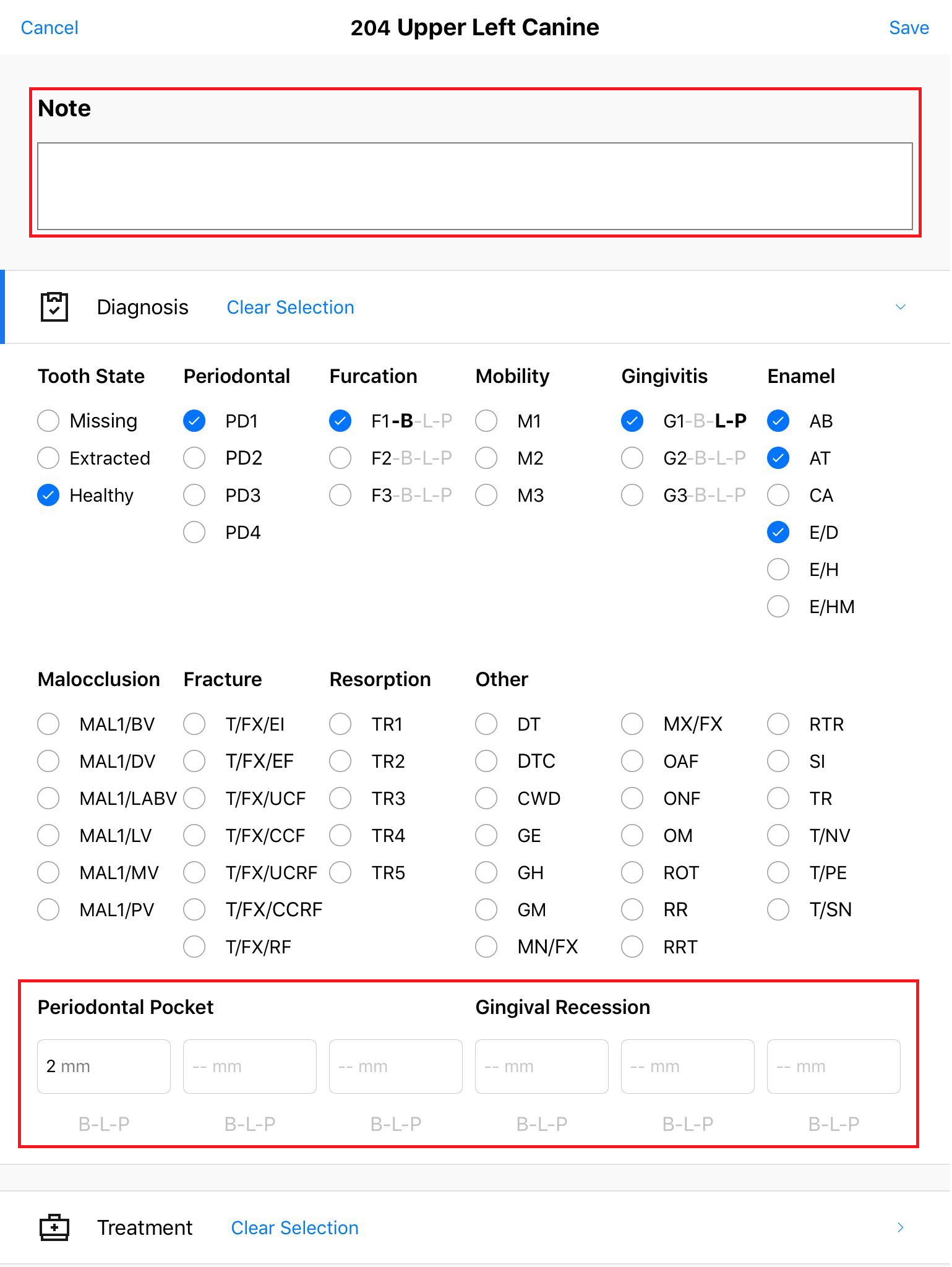 It is possible to enter exact numerical values for the Periodontal Pocket, and Gingival Recession, just tap on the field, enter the value, and click DONE: