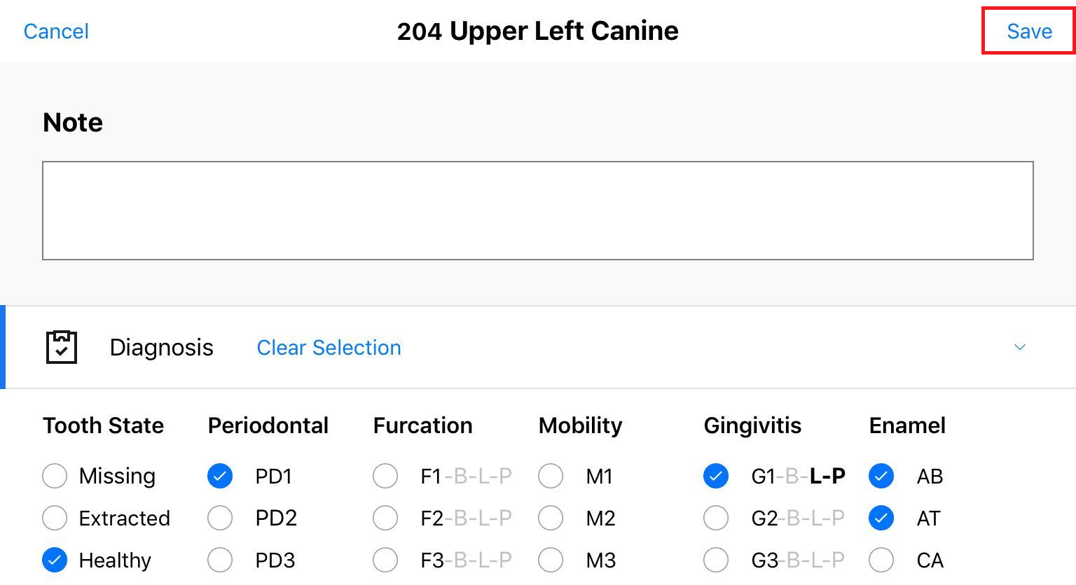 To avoid uncertainty, certain conditions, such as Tooth State, Periodontal, Mobily, or Calculus can have only one option selected.