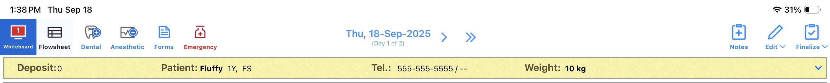 Icon Color Feedback: The Dental and Anesthetic icons are dark gray with a plus sign (+) when there isn't an active sheet, indicating you can start a new one. The Flowsheets and Forms icons, on the other hand, are blue when you're not on those sheets. When you open an active sheet, its icon turns black, giving you a clear visual signal of your location.