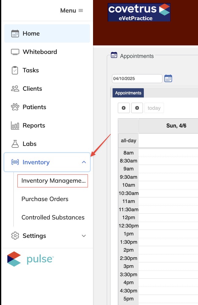 1. From your Pulse (eVetPractice) account open the Inventory drop down and select Inventory Management: